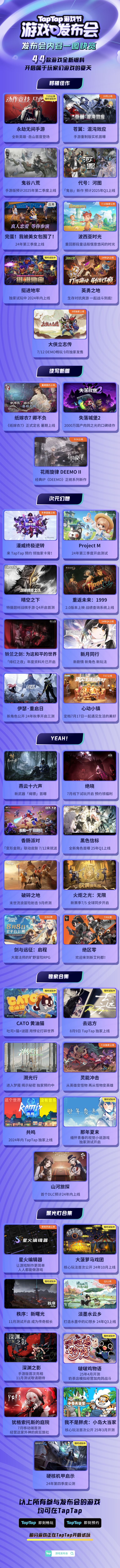 #2024TapTap游戏发布会 终于来啦~~六个内容板块内容,为玩家们带来了玩法和风格纷呈的作品: “移植佳作” 引得千万人翘首企盼; “续写新篇”带来延续前作精髓的IP系列作品; “次元幻想” 呈现多款具有迥异世界观和玩法的新游; “YEAH!” 如其名,带来的是具有爽快操作、令人直呼过瘾的精品游戏。这其中有的已经上线带来了最新的版本内容,有的即将上线令人摩拳擦掌。