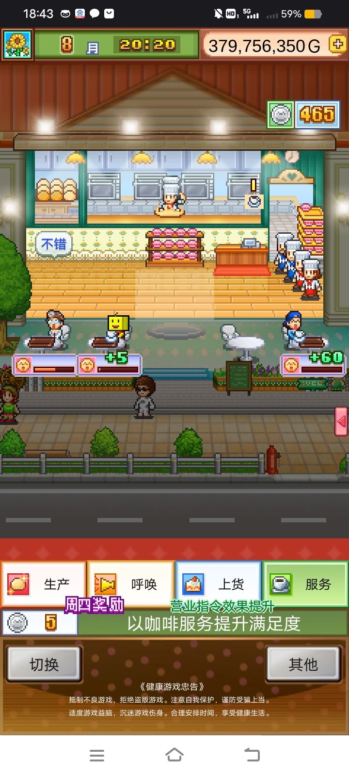 第四,早上开档的时候,疯狂召唤客人,当你看到田先生过来的时候,在他快要到货架的时候补货(客人有钱的话补多点,更容易一下子爆好感),这样就可以稳扎稳打的让他吃到蛋糕(一般三个他最喜欢的蛋糕就可以爆好感,如果客人只买到两个记得弄咖啡,咖啡好也可以爆好感)(顺带一提,一般如果客人买到的蛋糕他越喜欢,咖啡也就越容易好,也许是因为吃了棒的蛋糕?)