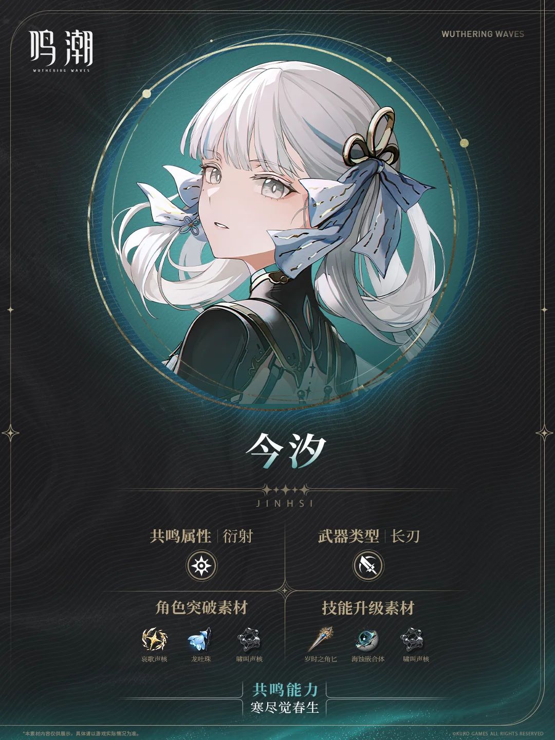 今汐拥有两套普攻模组,是目前鸣潮独一档的角色。今汐的输出主要来源是共鸣回路中特殊的共鸣技能【惊龙破空】。共鸣技能【惊龙破空】还可以消耗被动【韶光】来提高【惊龙破空】中【炳星】的伤害倍率(10级共鸣回路,每点【韶光】额外造成44.5%的倍率)(被动能量【韶光】获取:可以由队伍的其他角色提供,①造成属性伤害提供一点,②协同攻击提供两点,同属性伤害每三秒获取一次,延奏技能可以使CD变为一秒)