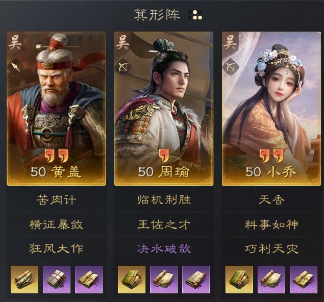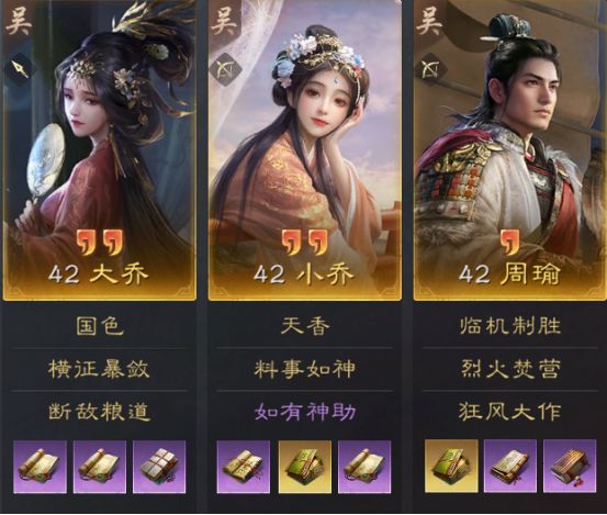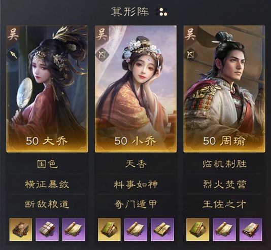 大乔重点在于前排抗伤和施加异常效果,战法方面横征暴敛是最佳选择;小乔目标在于给敌军施加异常状态,因此带料事如神和奇门遁甲,替代战法为决水破敌、束手无策、出其不意;周瑜为主要输出,携带烈火焚营、王佐之才,替代战法为狂风大作、上兵伐谋。