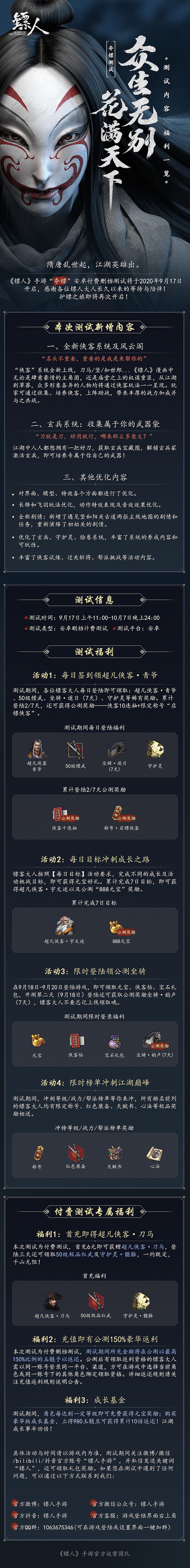 具体活动与时间请以游戏内为准,测试期间关注微博/微信/bilibili/抖音官方账号“镖人手游”,并私信发送关键词“镖人”,还可领取礼包奖励。如果您在测试中遇到了任何问题,可以通过以下方式联系到我们。