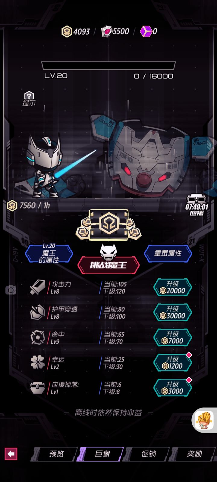 2.挂机收益完全取决于魔王等级,魔王打到实在打不过后可以随意调整技能等级