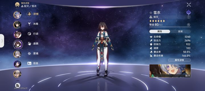 然后为什么不需要专门堆击破 上面我说击破100+就够了,首先我们要知道雪衣有一个额外能力是根据击破特攻提高伤害,但是是有上限的最多不超过240的击破,也就是如果过了240的击破雪衣再高击破也没用,就用130击破算,4魂雪衣给40击破,阮梅天赋给10,带钟表匠给30这时你的击破都有220了,完全可以吃完这个额外能力,所以当击破足够130时,就可以把词条给到双爆,并且雪衣的击破词条还是很好堆的,行迹给37,叠五铭记给56,这时你面板白值都有93了。