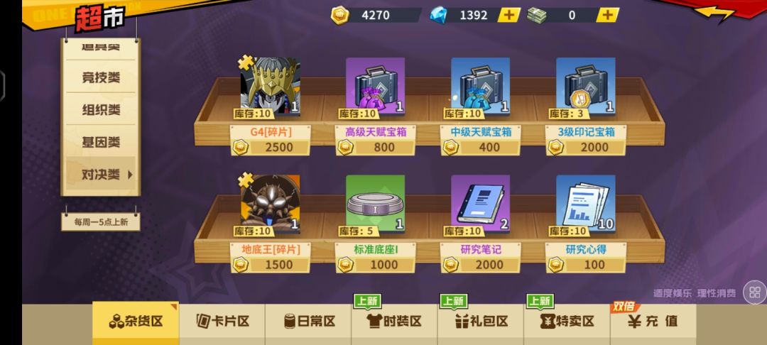 商店必买:基因类就升星卡和专属技能书(升星卡优先)还有鬼徽章碎片