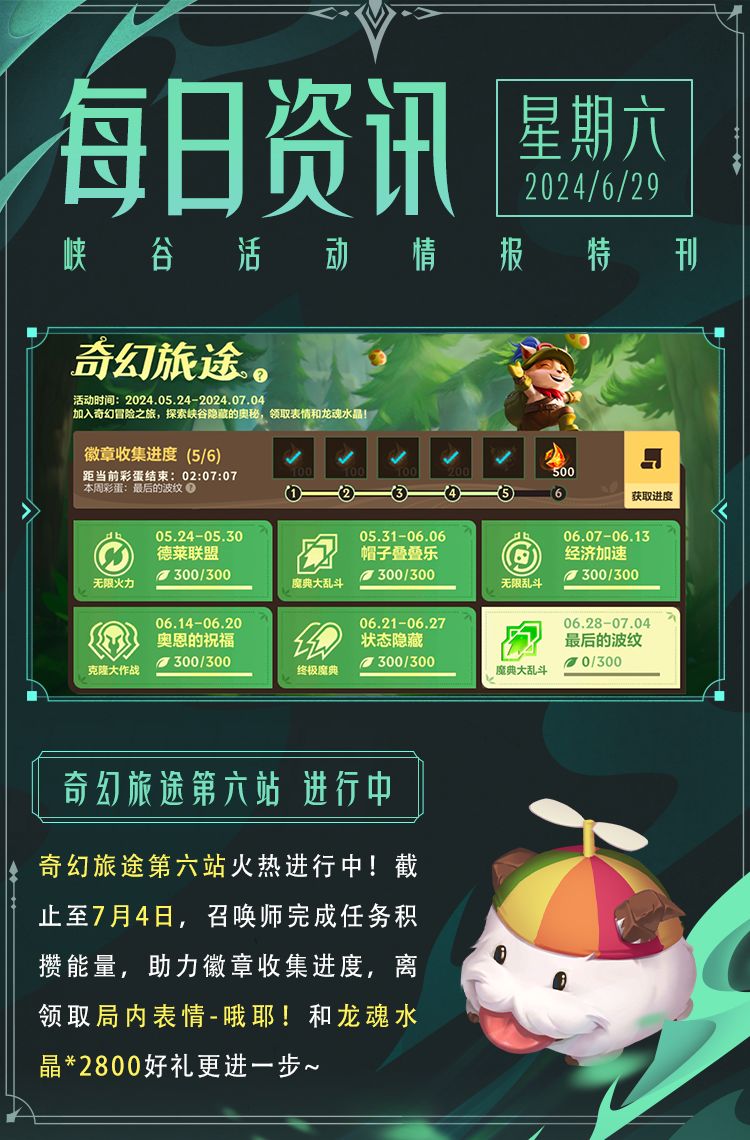 快来和萌竹一起,学习峡谷生存技能吧!截止至7月15日23:59分,召唤师完成活动任务,获取竹笋进行探索,即可将高级限定守护灵、专属头像框-熊有成竹、无畏队旗-熊有成竹、腾讯公益徽章等好礼一并带走啦~