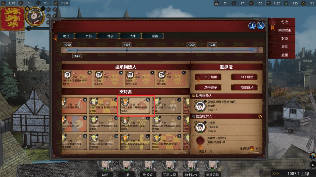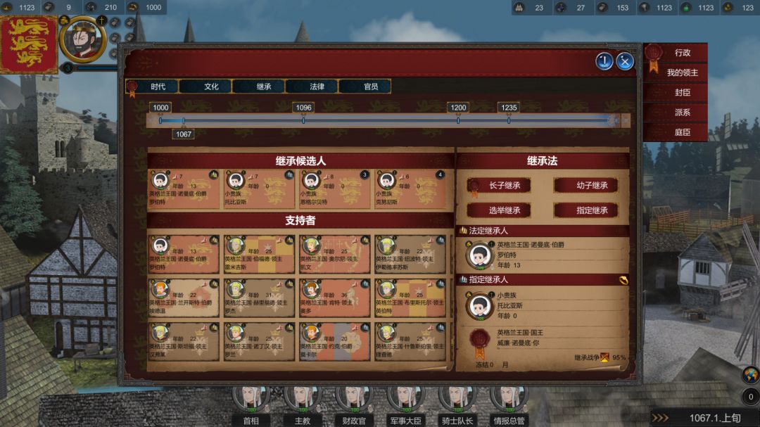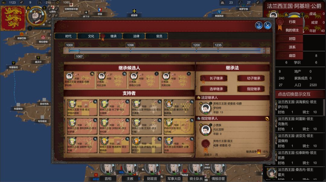 法律继承:继承法规定由谁继承你的爵位和领地。大部分封臣可能都会倾向于此,特别是守旧派的领主们!他们更加遵循继承法。