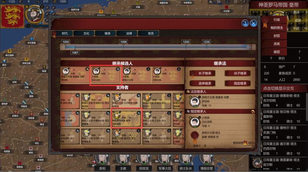 由于种种原因,我对老二,我特别钟意!天才一个,以后必成大器,我还找上帝开了光!夜里给我托梦,所以我执意要让老二继承,这导致法律继承人和我喜欢的继承人有了区别,加上封臣们各有自己的支持对象,继承战争概率飙升,老二有了我的支持 这下他变成了7个领主支持。