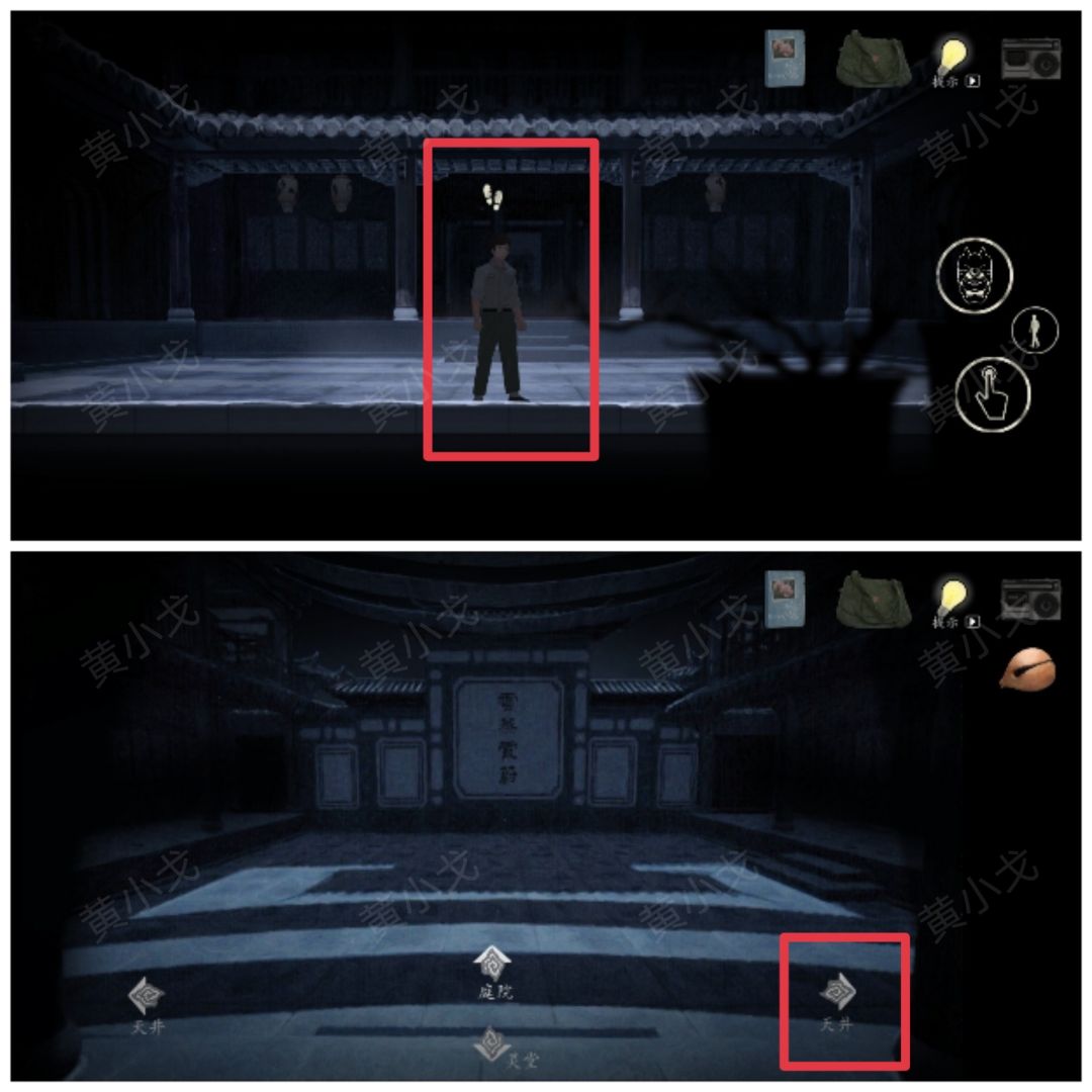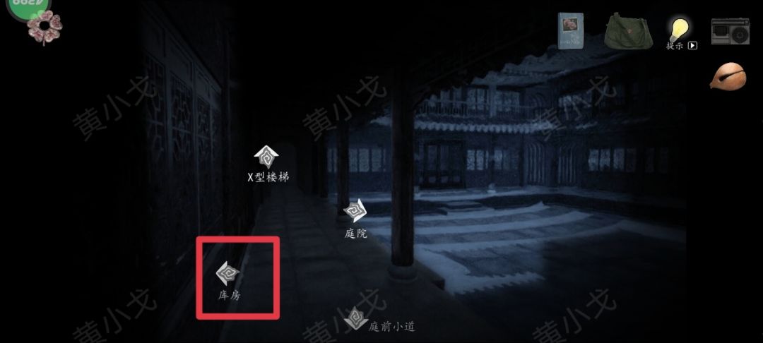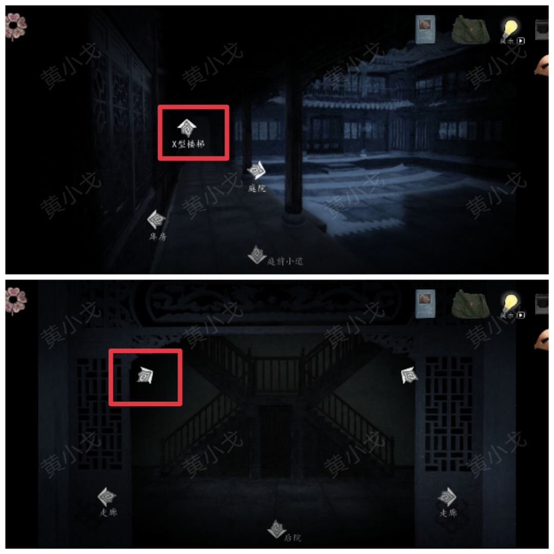 23.(右侧天井)前往右侧天井:下X型楼梯→右侧走廊→庭院→庭院中间→右侧天井