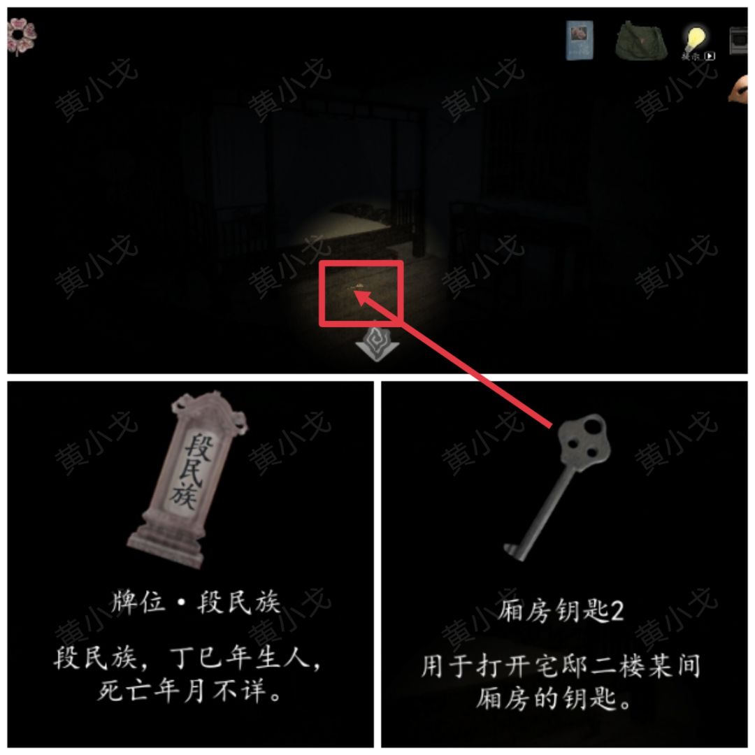 19.(段民族房间)剧情过后,获得【牌位·段民族】;点击拾取地上的【厢房钥匙2】
