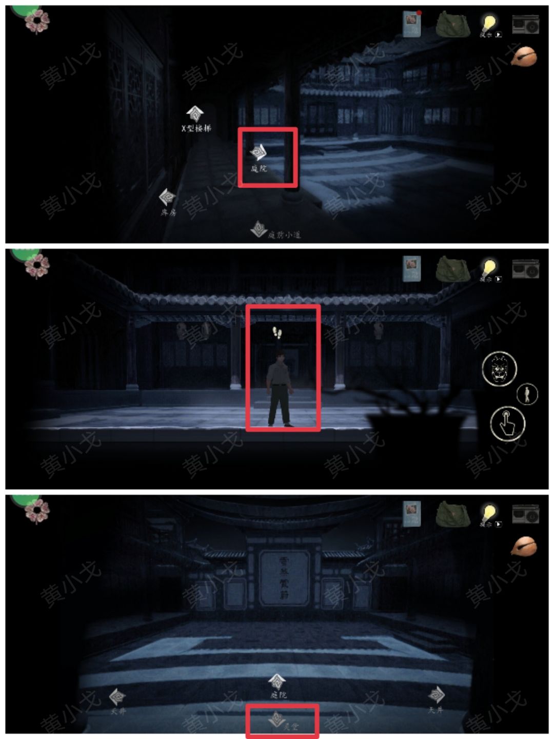 4.(灵堂)前往灵堂:庭院→走到庭院中间→灵堂
