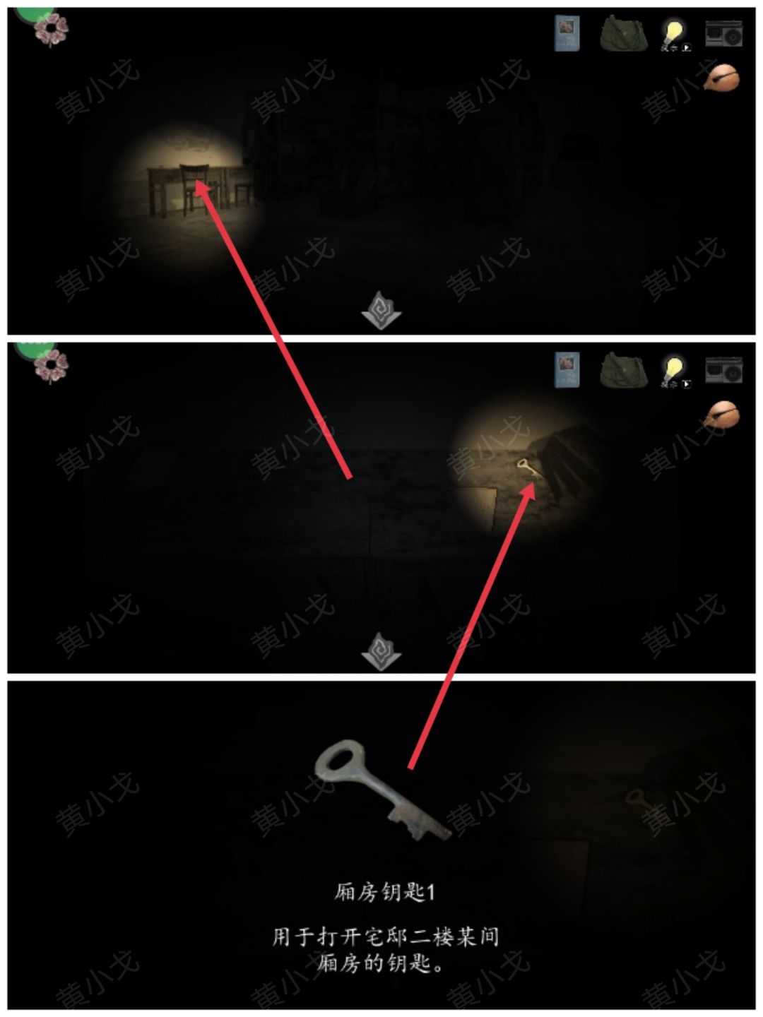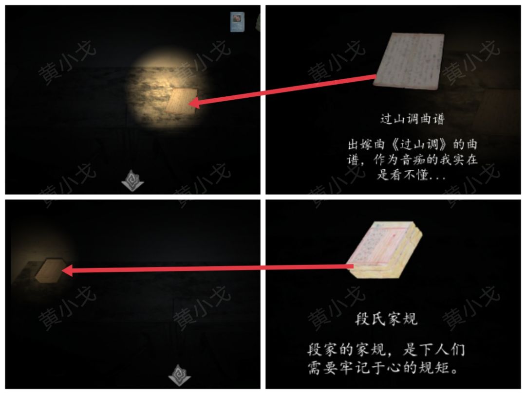 14.移动光源到桌子,在桌子上获得【厢房钥匙1】、【过山调曲谱】和【段氏家规】