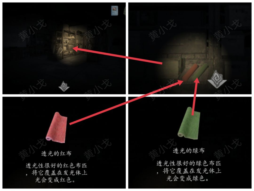 28.点击地上的法阵,把【透光的红布】、【透光的绿布】、【透光的黄布】放到灯罩上,根据《古法还魂术》上的线索,调整对应的影子到对应的时刻上(