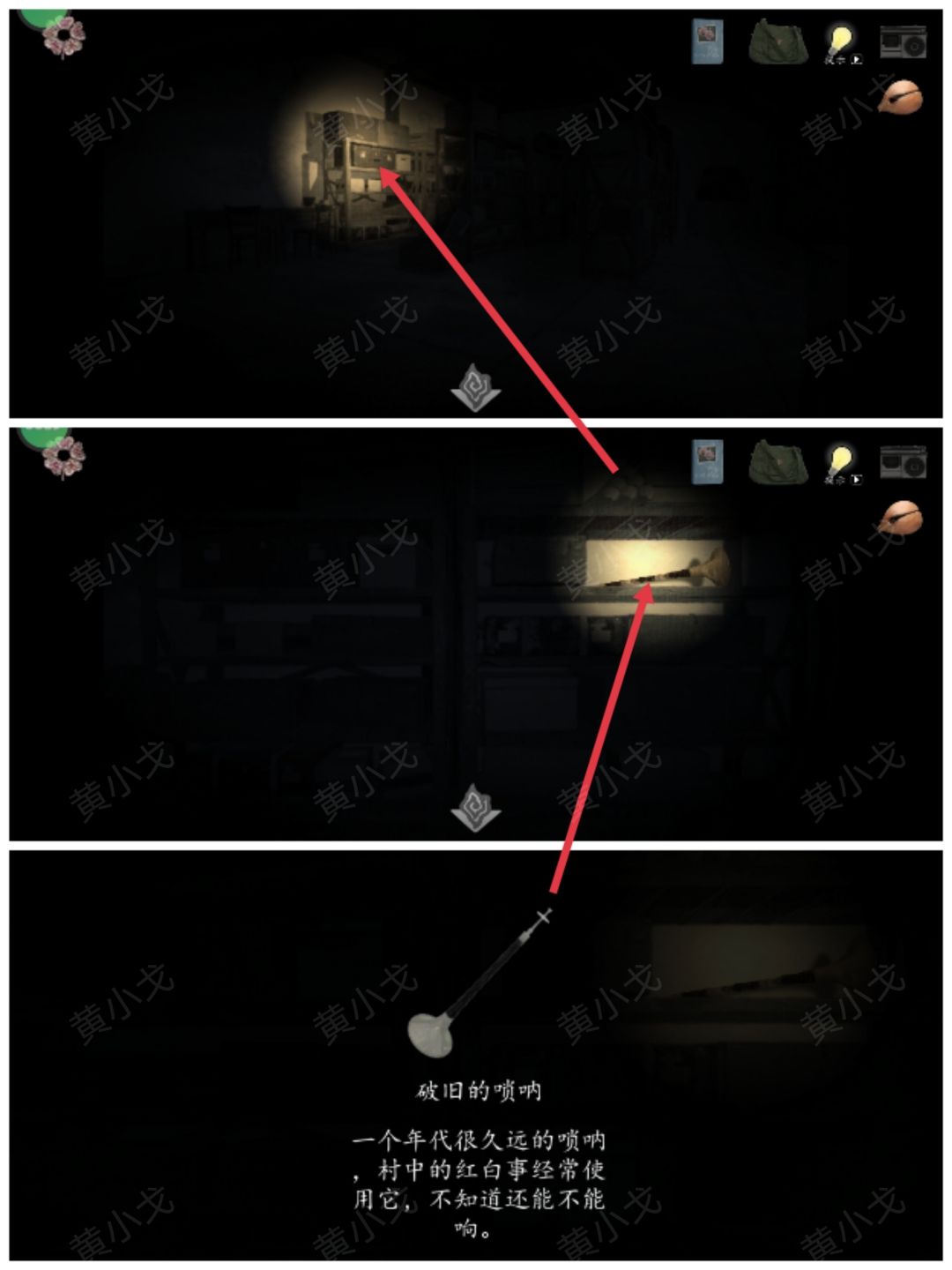 11.移动光源到里面的架子,在架子上获得【破旧的唢呐】