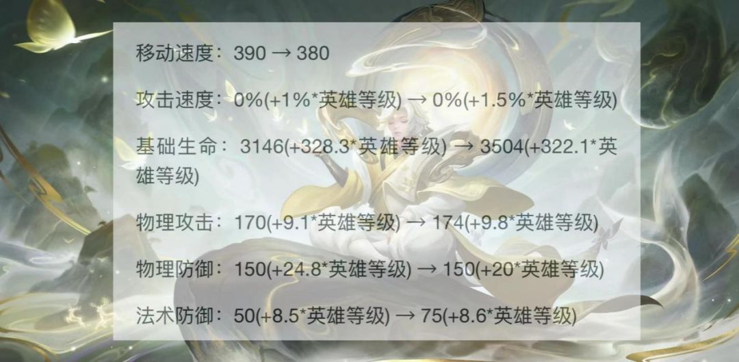 庄周的被动和一技能并未发生变化,基础属性和其他英雄一样进行了调整,都小幅增强了攻速,生命值和攻击力,但是削弱了庄周的移动速度和物理防御,这让庄周不再那么“滑溜”了。