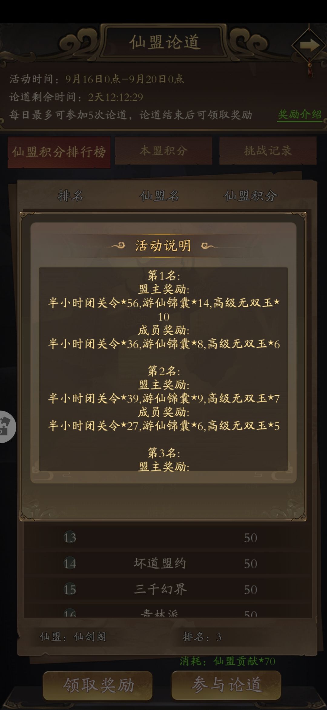 上次说过一次,这次还是这样,我就想问问仙盟里面的副盟主护法头衔是干嘛的,就是看的吗第二名还没有第一名成员的奖励高,副盟主不说吃口肉吧,好歹给一些汤喝,你们是碗都不给,这个奖励有什么意义,仙盟贡献又不多,也不做调整,改一下这个奖励设置总比从新做一个活动容易吧,你自己看看差距有多大这么多次活动,闭关令都可以相差上千个了,叫大家怎么玩,如果副盟主跟护法没奖励那就不要设置这个头衔,怪不得人越来越少游戏不做好,还想要人玩,早晚玩完