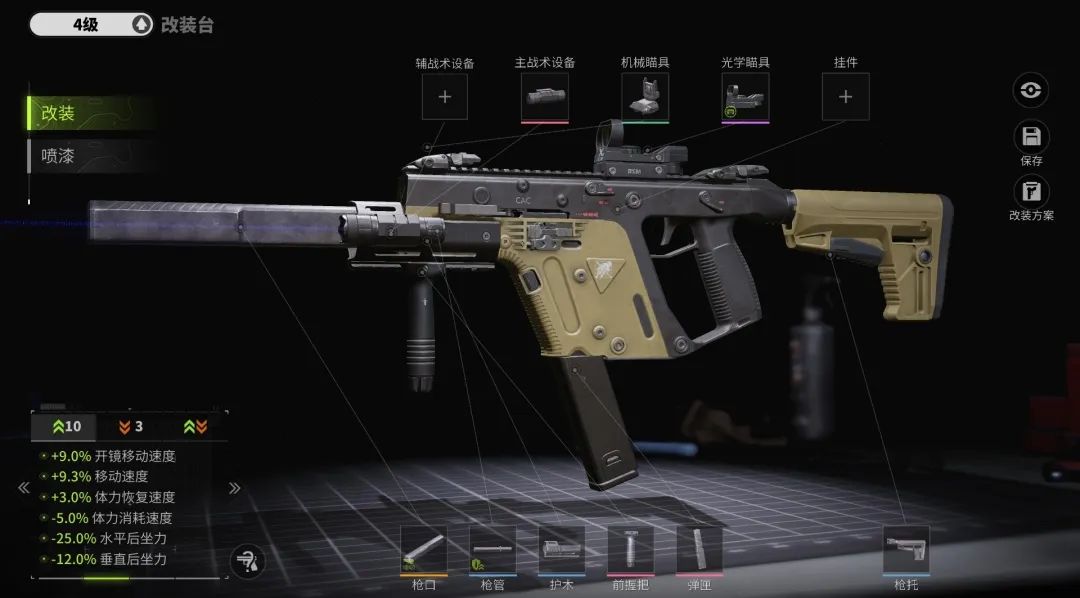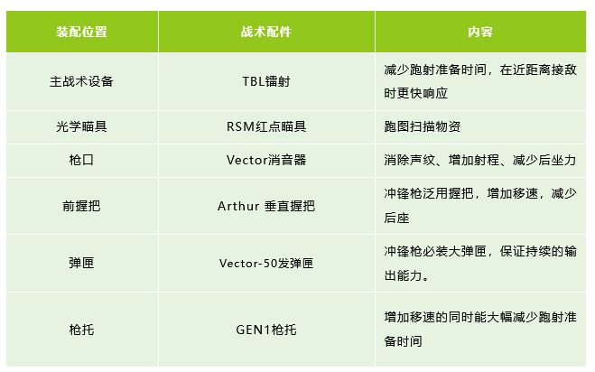 Vector冲锋枪自带削甲值强化,加上极快的射速与极低的后坐力,在工厂等室内近距离地图具有强力的作战能力,因此下面这套改装方案主要加强移速、体力消耗和减少跑射准备时间,在近距离遭遇时更快开火,更加灵活。