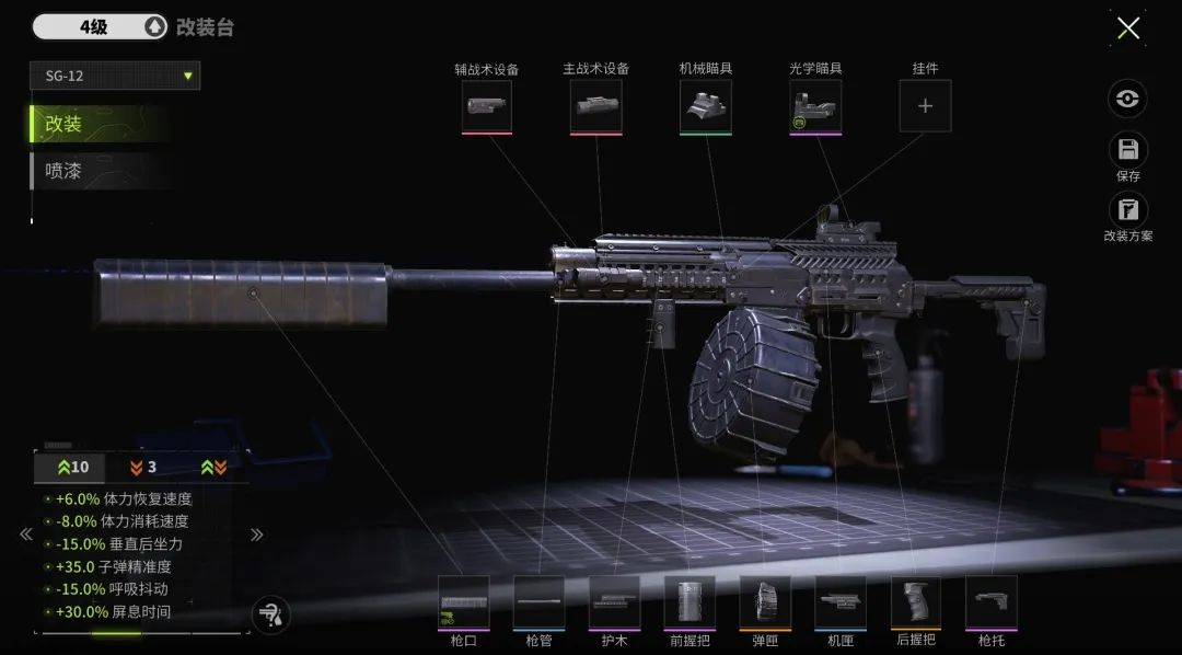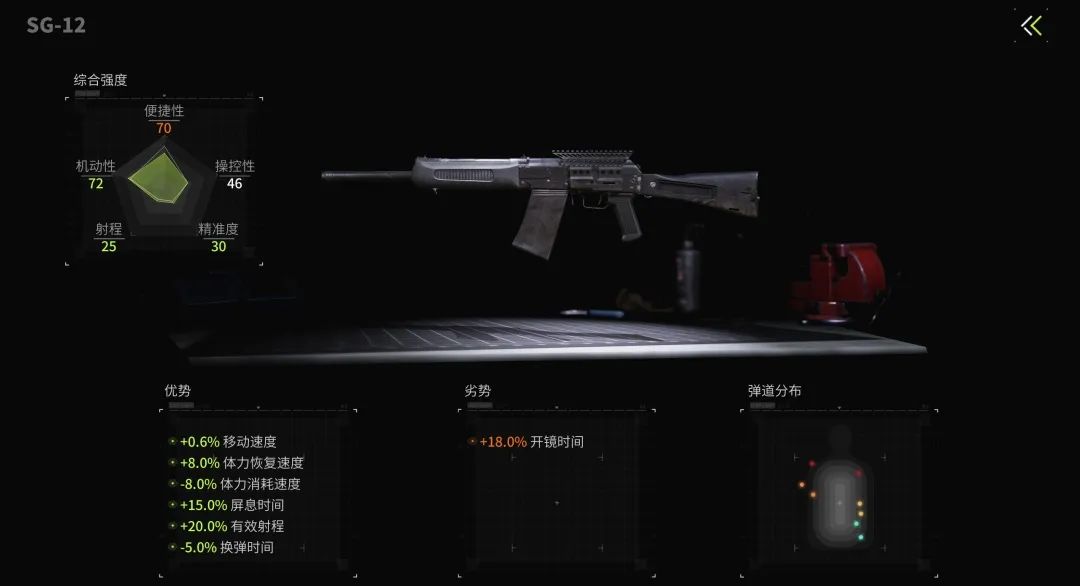 SG-12又称为“龙息喷”,改装目的是提高爆发速度取得先手优势,配合龙息弹的燃烧以最快的速度压制对手,所以改装思路也很明确:减少跑射时间、降低后坐力、提高子弹精确度。