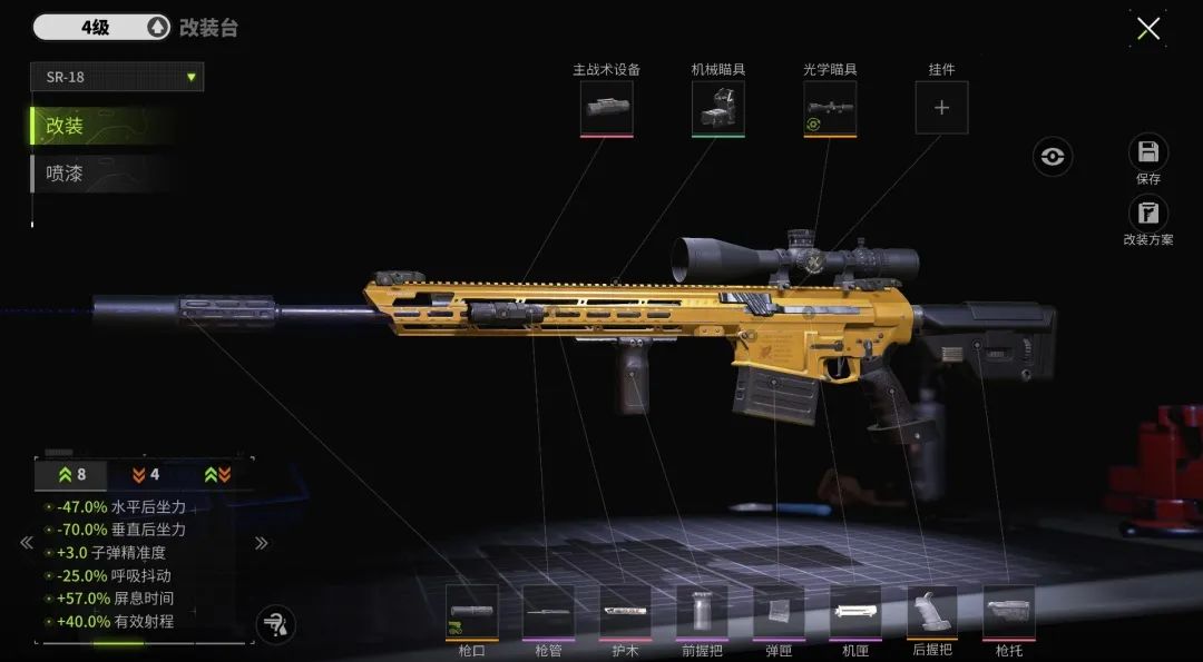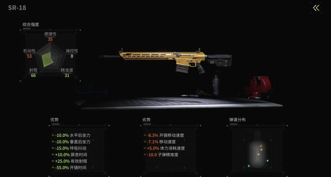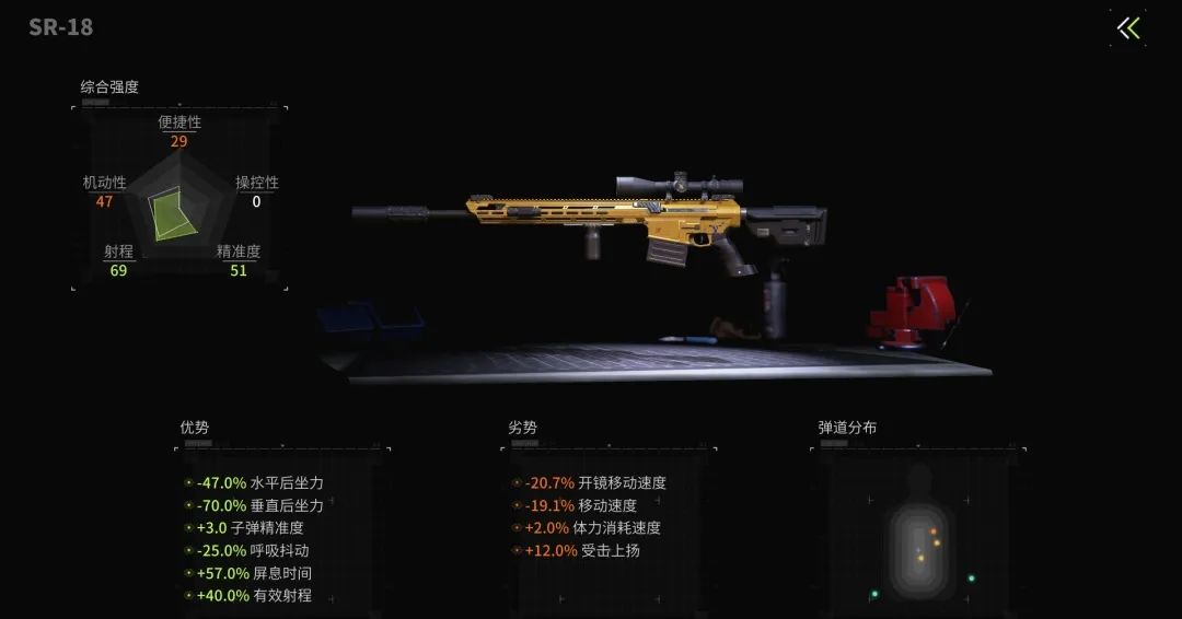 SR-18的性能各方面都很优秀,高额的伤害和极好的操控性,让SR-18的使用难度相对较低,萌新萤火虫也能轻松驾驭。下面这套改装方案侧重于优化SR-18的屏息时间、呼吸抖动和射程,照顾萌新萤火虫更长的瞄准时间,延长有效打击距离。