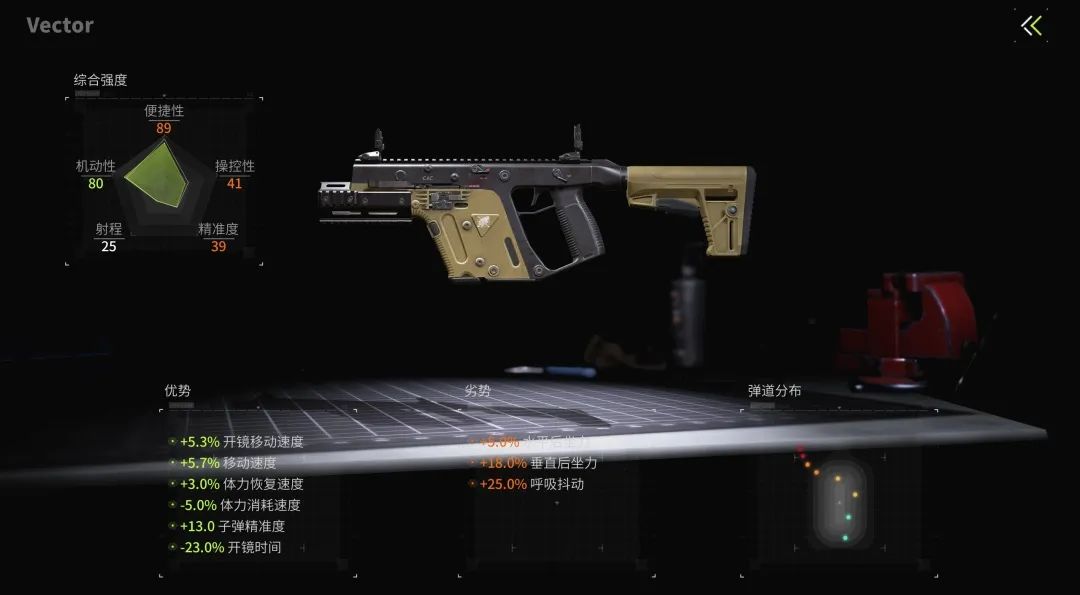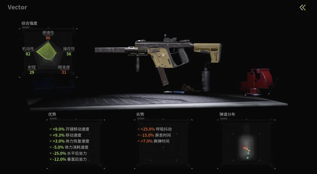 所以冲锋枪的改装重点在于提升机动性,降低跑射准备时间,使其能够灵活应对各种室内作战场景。下面小萤以Vector冲锋枪为例讲解冲锋枪改装思路。