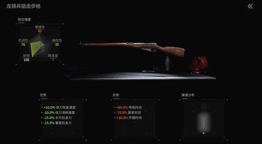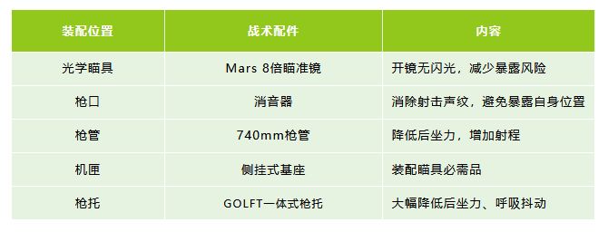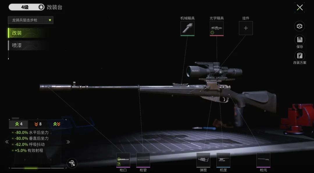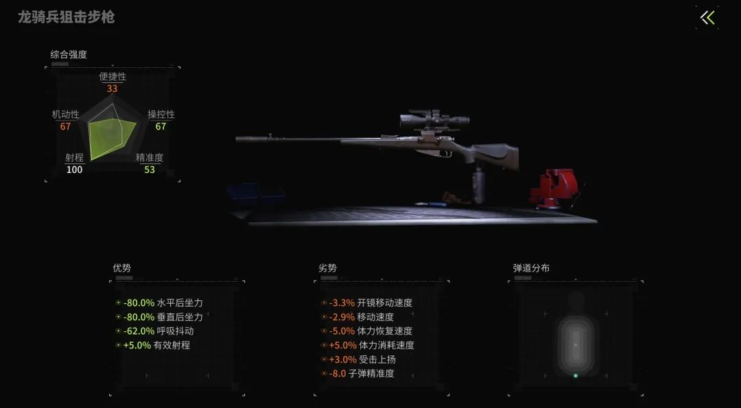 狙击步枪拥有极高的单发伤害,但射速低的特性导致其容错率低,因此通过改装减少开火上扬和呼吸抖动,有效减少空枪和射击后目标丢失的概率,提高击杀效率。由于不适合近距离作战,高倍镜也是必需品。下面小萤以龙骑兵狙击步枪为例进行改装。