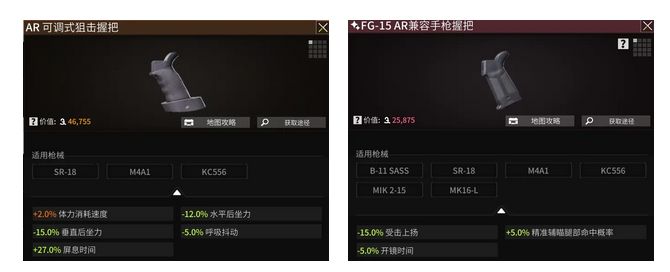交战距离也影响配件选择。AR可调式狙击握把能降低枪械后坐力,而FG-15兼容手枪握把则降低受击上扬,同时增加辅瞄命中腿部的概率。因此AR可调式狙击握把适用于中远距离作战场景使用,FG-15兼容手枪握把更适合室内作战使用。