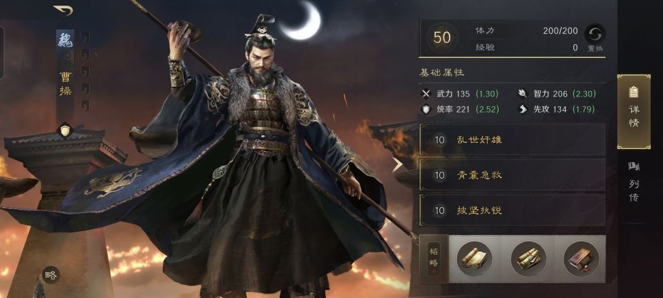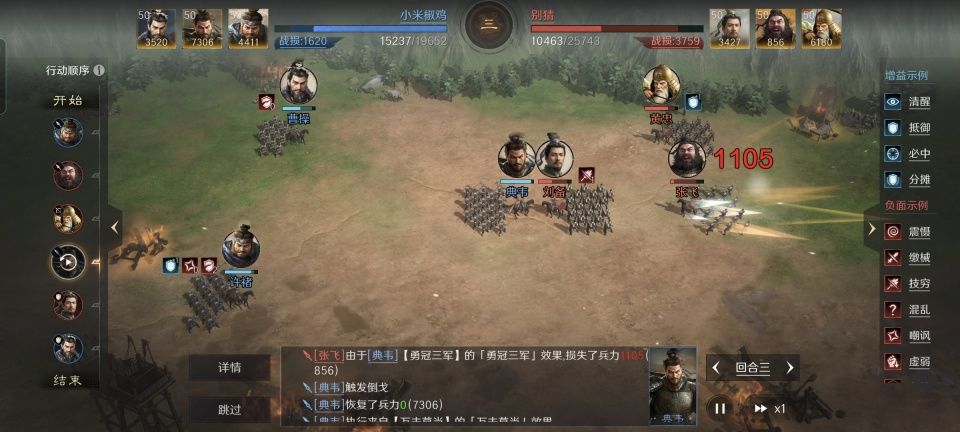 先看曹操的战法堆叠情况,乱世奸雄的基础上附加青囊急救和披坚执锐。值得注意的是,他们摆出的是锥形阵,把典韦给推到了前排,典韦的武力值相比许褚又更高,从而同时受到了披坚执锐的攻防加持。孟德新书下卷,也是为了给典韦加反击伤害的,足以锁定菜刀选手就是典韦。