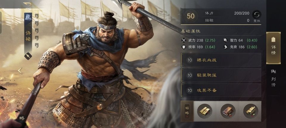 同样都是曹操的贴身保镖,可相比起典韦来说,许褚的防卫属性要更明显一些。三谋匹配给许褚的默认战法裸衣血战,主要是提升他自己的先攻和连击,这个叫小米椒鸡的兄弟通过第二和第三战法,把这个特长发扬到了极致。由于裸衣血战的普攻次数增多,使得轻装驰援可以触发更多次数的抵御来掩护典韦。攻其不备,也是借助连续普攻来给对面施加技穷和震慑,摆明就是为了让对面的张飞和黄忠哑火。轻装驰援和攻其不备都是追击类战法,许褚的韬略小金书又给叠加了5%发动率,足见压制的持续时间有多长。
