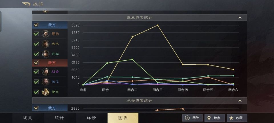 如此筹谋之下与忠义弓交锋,许褚高频发起轻装驰援和攻其不备,让张飞和黄忠很难施展。典韦的普攻则多达16次,单是普通攻击的斩敌数都突破了1万,刘备就算再能奶,也完全挽回不了这样的兵力折损。更何况,在许褚的连续震慑和技穷之下,刘备的治疗技能也几乎没有发动的机会。