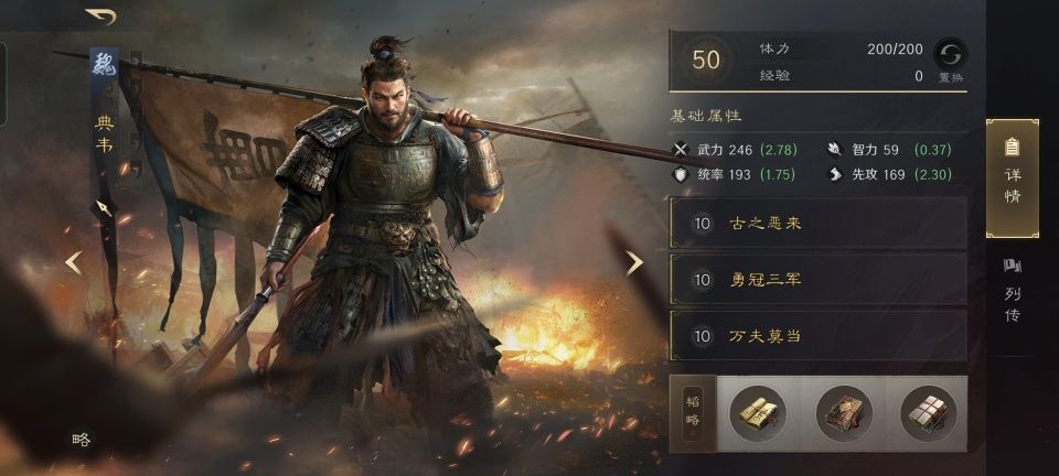 典韦的古之恶来战法,在三谋里具备高额的反击和强力的增防,加上勇冠三军的倒戈和万夫莫当的传递伤害,使得典韦在前排具备一定以战养战的能力。三本韬略,谋战避险和折武,减伤的同时提高反击伤害,走的就是硬碰硬路线。