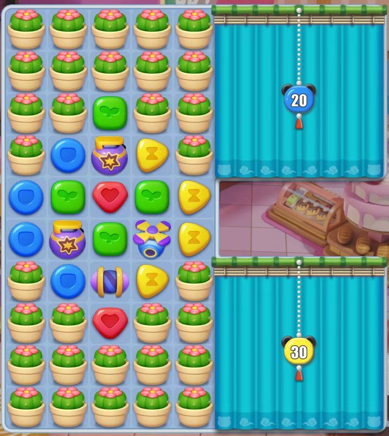 669关可以作为冲刺火箭机制的典型关卡,左侧花圃解锁后上方会掉落仔仔熊存钱罐。难点在于开始的棋盘较小,不过解锁火箭需要的棋子数量不多,并不需要刻意开图,收集棋子时多用道具节省步数即可。利用冲刺火箭消除木箱后便没什么难度,步数也比较富裕,正常通关即可,有“螺旋桨+超级智脑”通关效率更高。