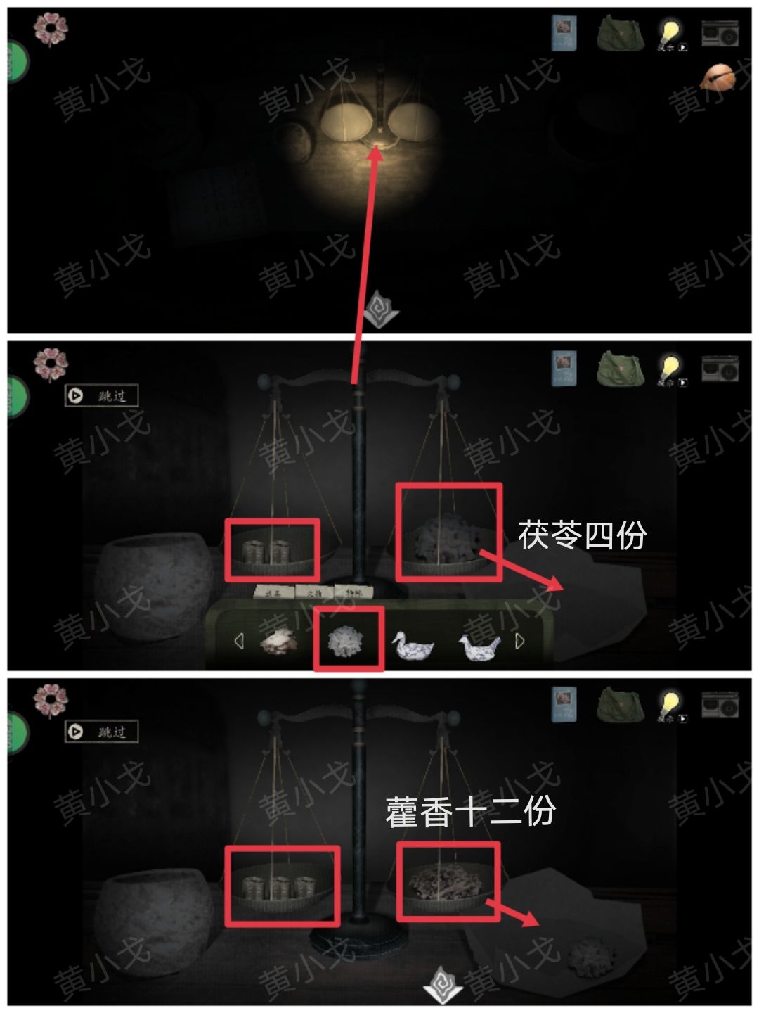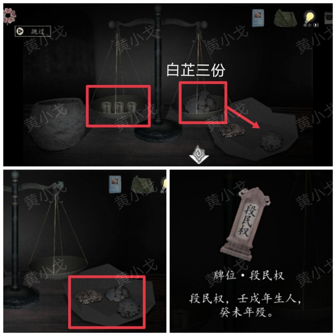 15.点击柜台上的称,根据药方上的线索,用称称出需要的量(茯苓四份、藿香十二份、 白芷三份)(即分别往秤盘里加多少次);配好药,获得【牌位·段民权】