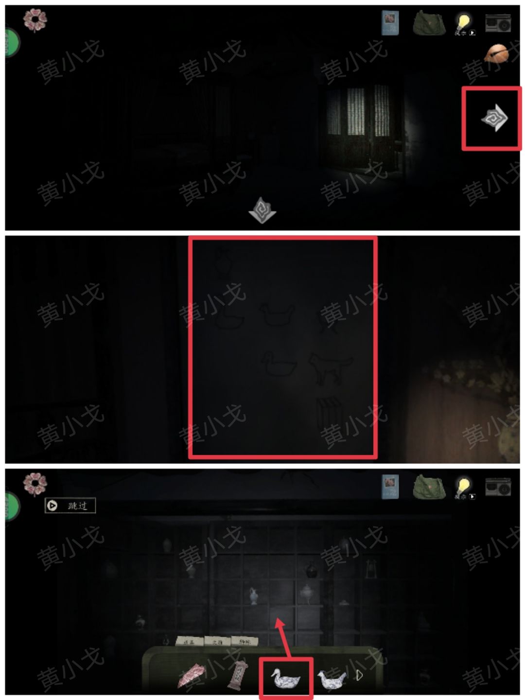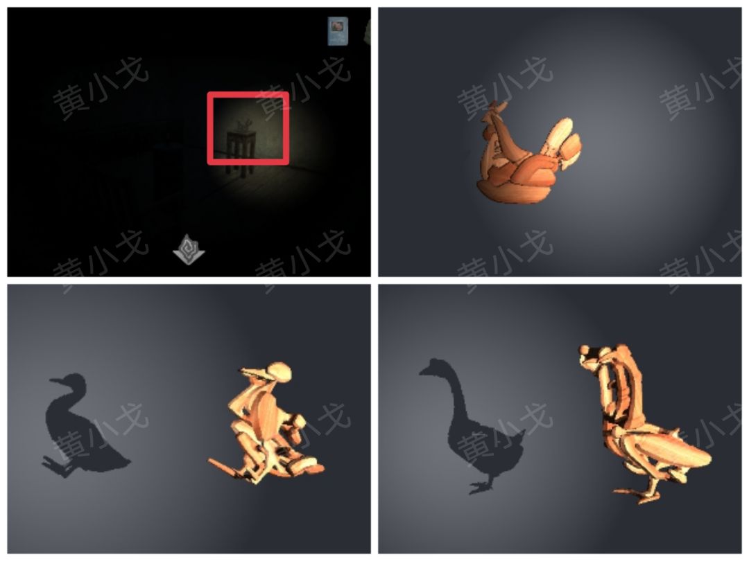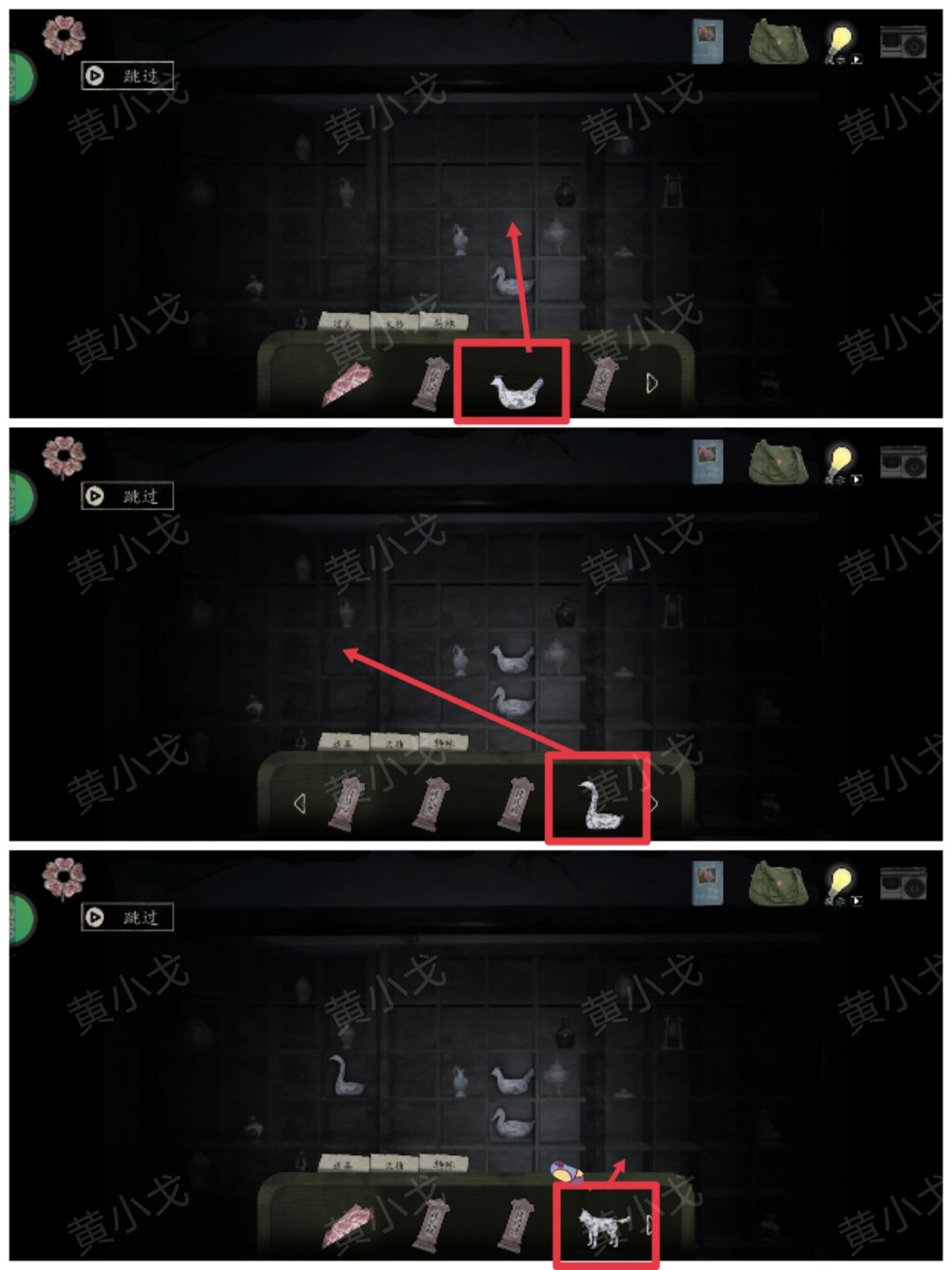 23.(段祁悦房间)点击右边的按钮,去到置物架;根据镜子上的图案,把【陶鹅】、【陶鸡】、【陶鸭】和【陶狗】放到正确的位置上;打开密室门