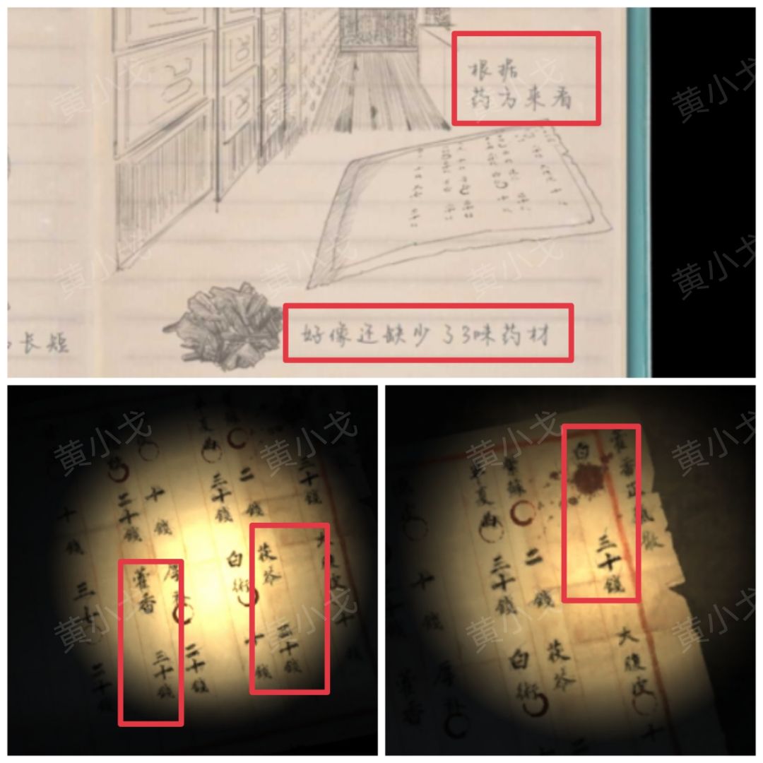 13.查看柜台上的药方,获得线索(缺少三味药材及量:茯苓二十钱、白芷三十钱、藿香三十钱,记录本上也有)