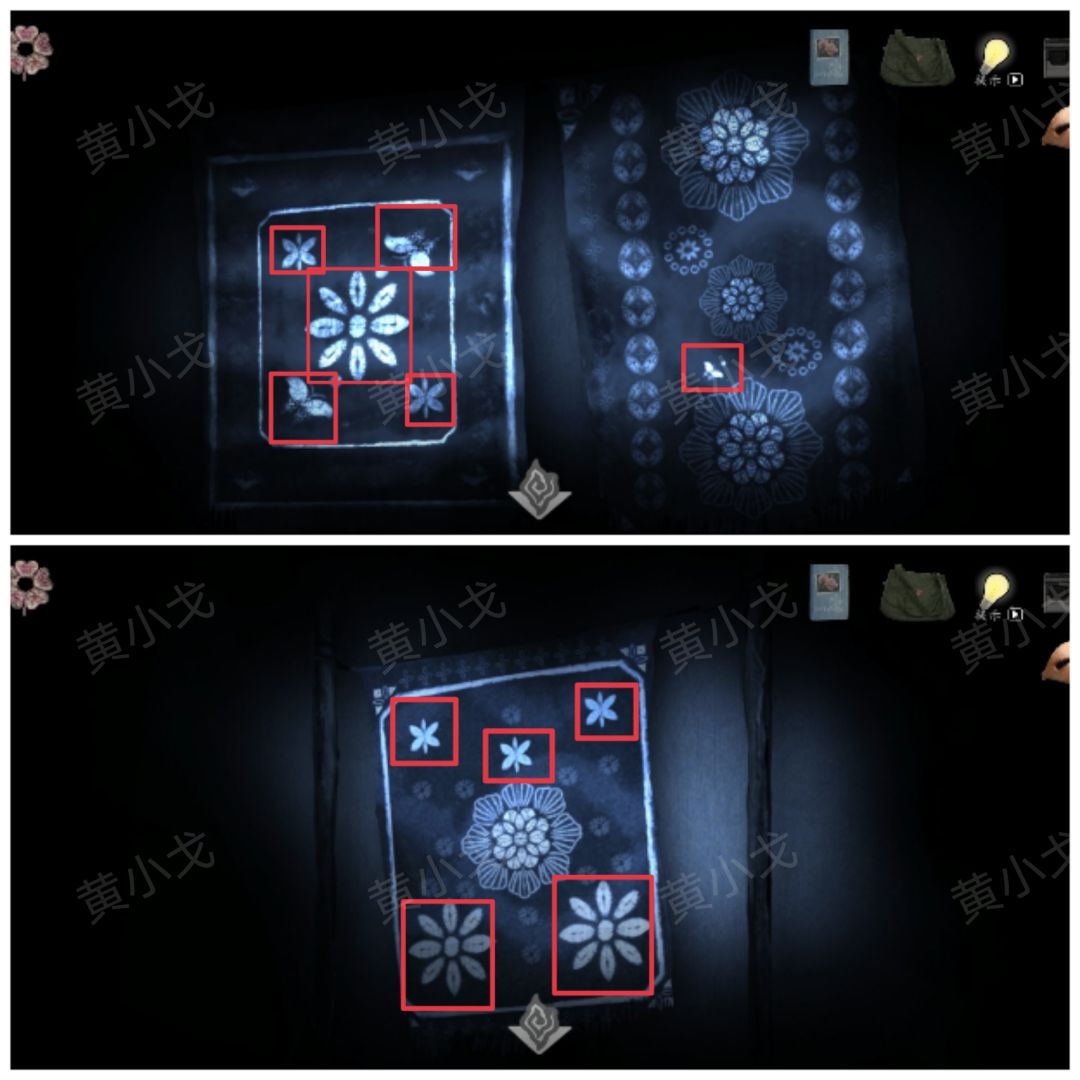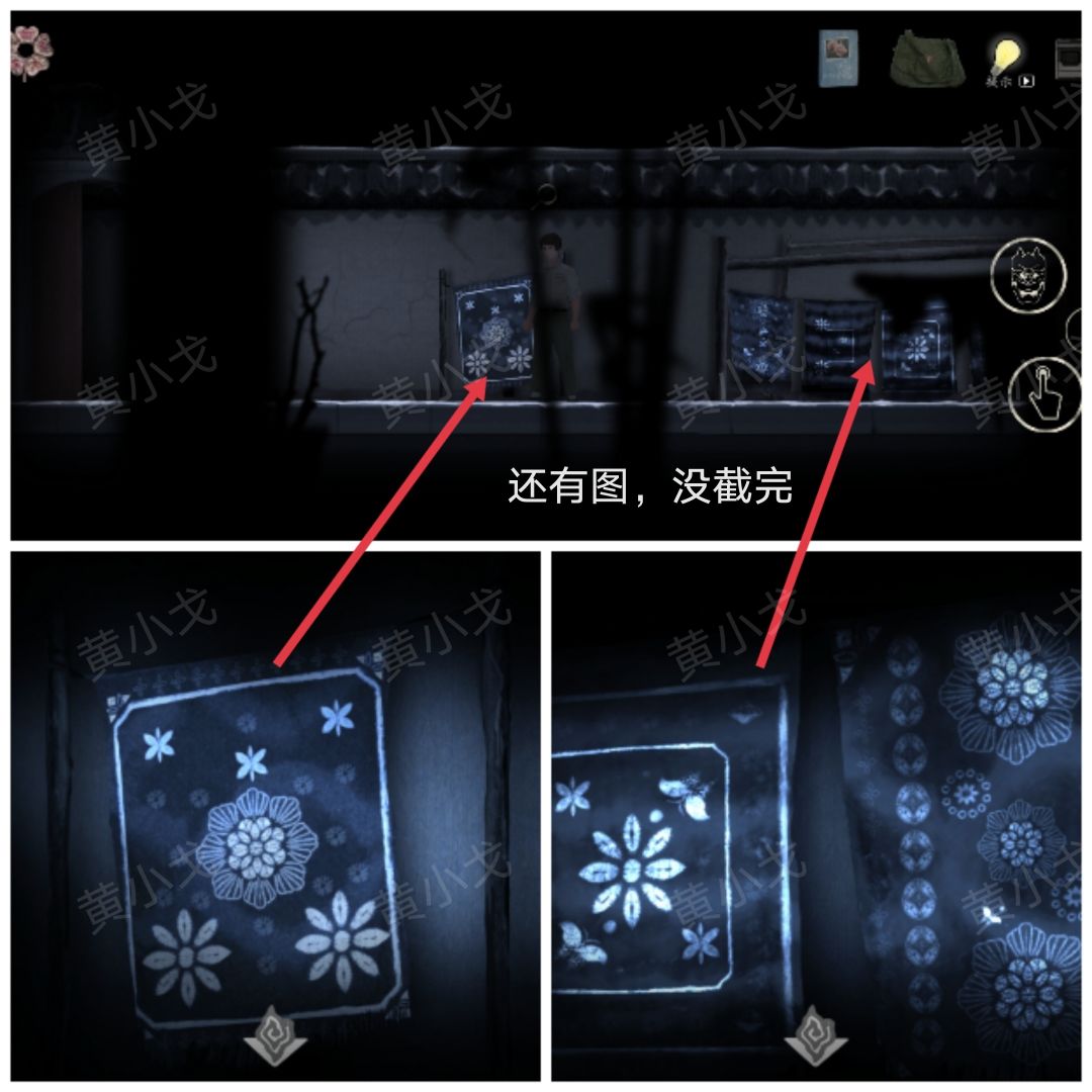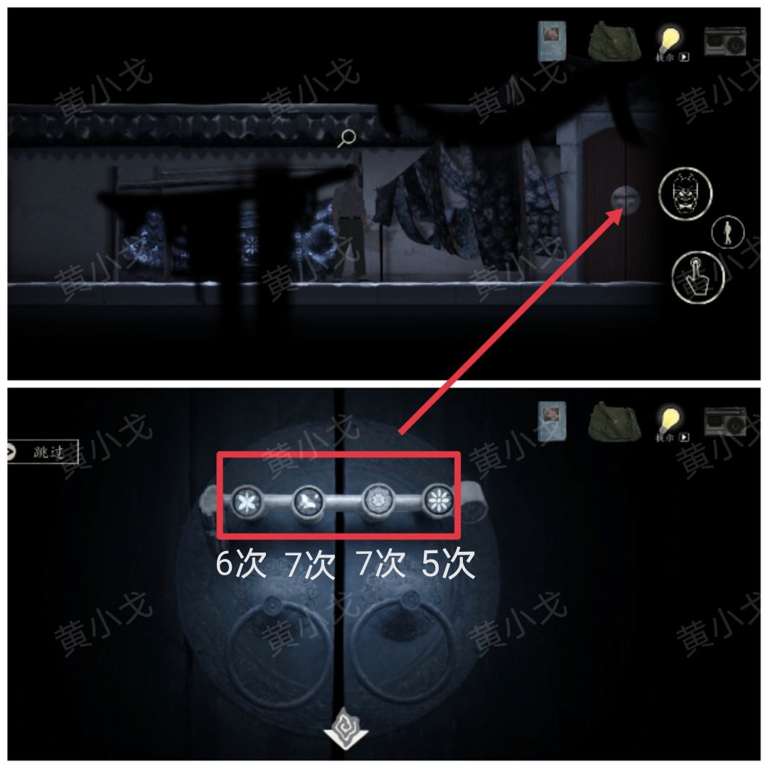 19.点击门上的锁,根据锁上的图案,结合染布上的线索(对应图案的数量),按6次、7次、7次、5次的顺序点击锁上的图案按钮,打开门,进入染制区