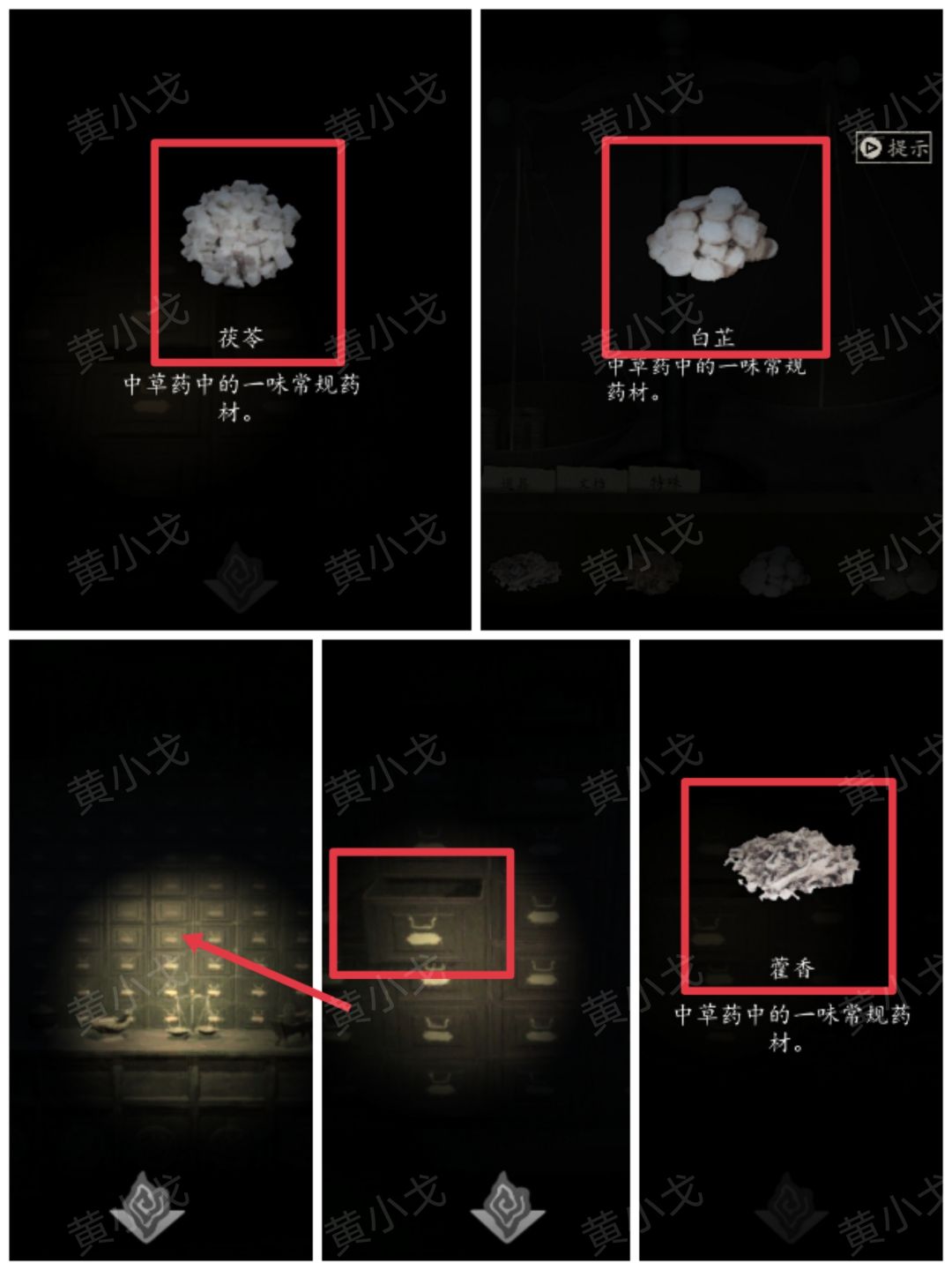 14.点击打开了的药柜,获取需要的药材:【茯苓】、【藿香】和【白芷】