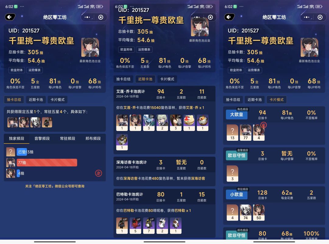 一键即可分析你的角色、音擎、邦布和常驻等各卡池抽卡情况以及欧皇程度,包括总抽数、五星花费抽数等,记录永久云端保存、永久可查。