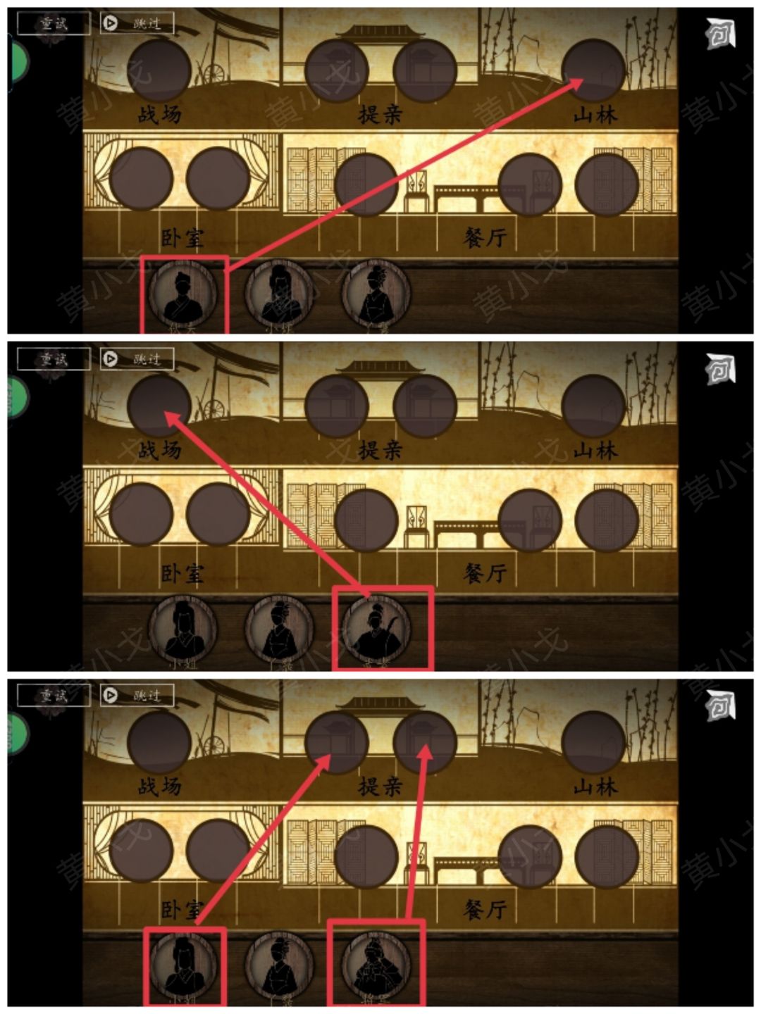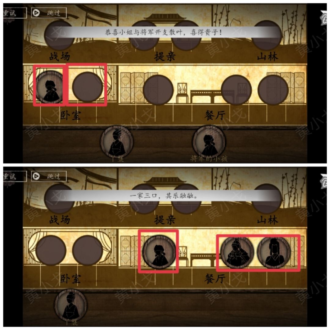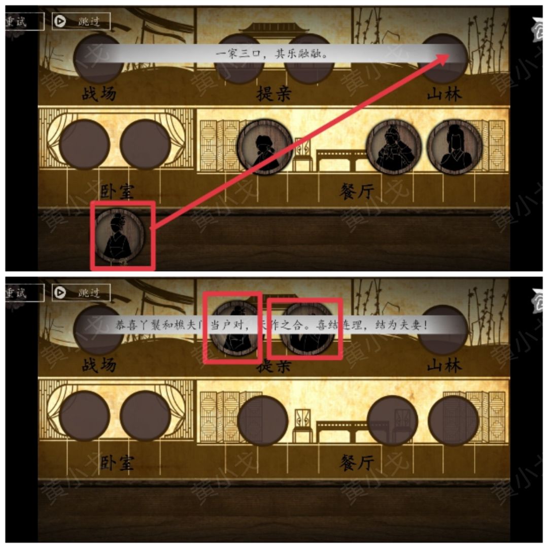 8-3.丫鬟去到山林遇到樵夫→丫鬟和樵夫提亲→丫鬟和樵夫卧室有樵夫的小孩→丫鬟、樵夫和樵夫的小孩餐厅)