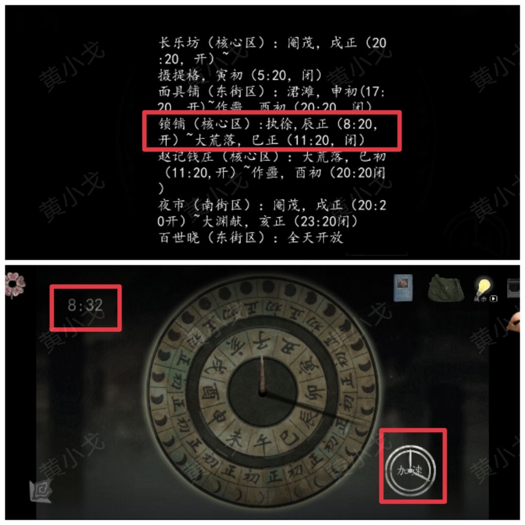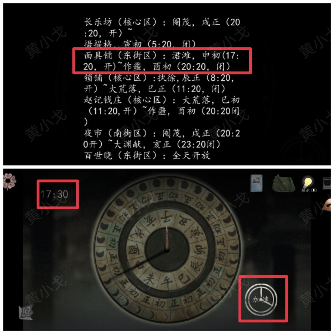 4.点击日晷盘,根据《商铺营业表》上的线索,调整时间为(面具铺:17:20-20:20)