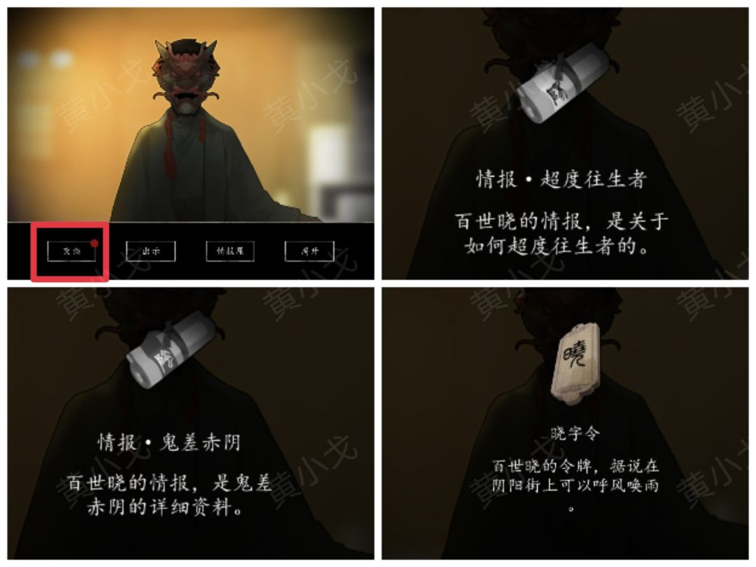 1.(东街区)点击与晓百事交谈,获得【情报·超度往生者】、【情报·鬼差赤阴】和【晓字令】