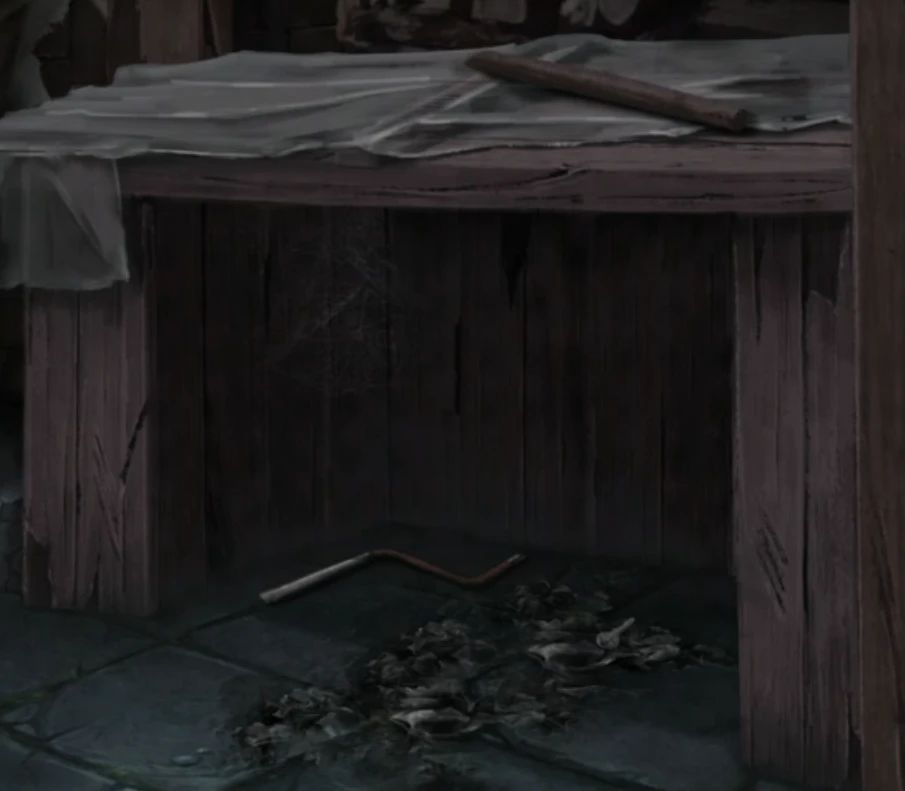 查看两个门中间的木机器,使用摇把后获得一些纸钱,查看右边的门,使用钥匙开门进入厨房,厨房左边脸盆旁边拿到一个水桶,右边炉子上拿到一壶开水,右边炉灶里面拿到烧火棍,炉灶左侧的木柴点一下发现可以挪开,优先挪开上面的就能看到下面的刀了,全部挪开拿到柴刀,恩,突然穿越到寒蝉的感觉。