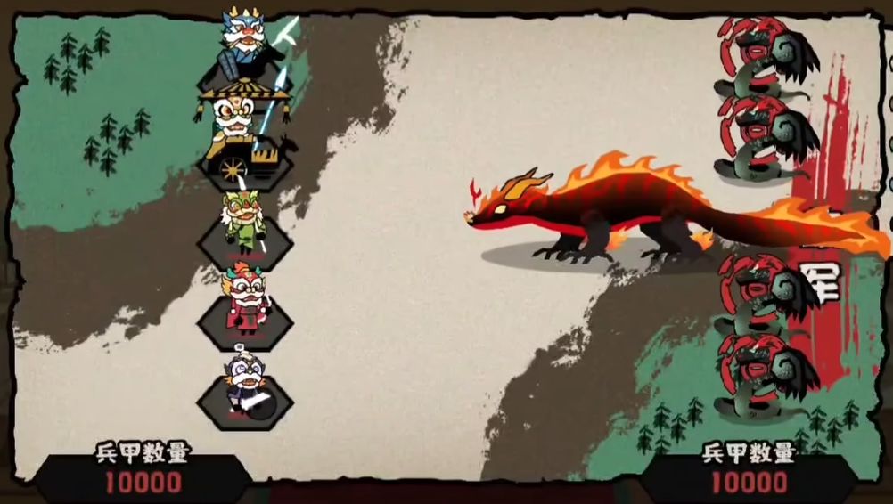 之后不用操作,让他们自由战斗。通常是车、骑先打掉上方的两个火蛇,枪兵抗住火之凶兽,弓、步打掉下方的两个火蛇。火蛇全部消灭之后,用移动卡集中到旗帜处,集火消灭它。