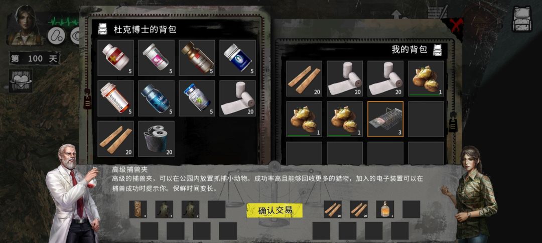 杜克博士一般重开过都会选第二天就刷到医院,然后看广告获得12把武器去跟他换木板和布,前面草药无所谓,没有大棚出来之前不需要。然后第二天去找街心公园,没找到那第三天再去找就找到了,地图搜索然后不是就不进去换个位置搜索就行。每天去公园交换比进医院方便多,而且还能在公园放陷阱找老鼠。
