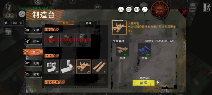 先做大棚需要先做发电机,前面要雪和做的东西太多了,尽量留着绷带或者夹板总80个,可以每天换满。钢需要再换,不需要不换,等60天之后大棚升满不缺食物的时候就可以换钢了,满级大棚3天12个土豆基本吃不完。
