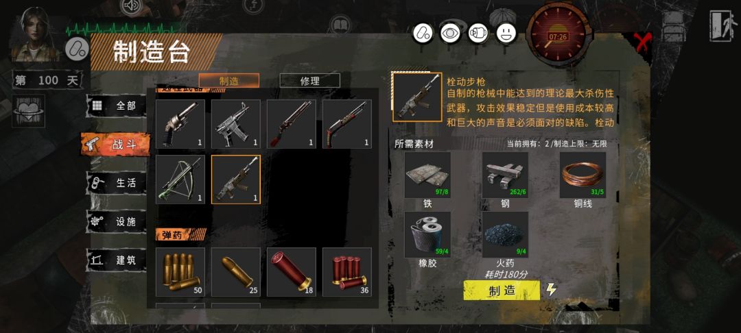 这里要说一下第二个公园的人物别去点,点了柯林•洛克就跑了,之后想换钢基本没稳定来源。现在进度到了一百天,我的目标是收集制造16把步枪的材料,子弹先来两千吧,第二公园可以换火药,所以钢至少要凑齐1300,多出来的300用来维持日常的维修。铁片找杜克博士换就行。