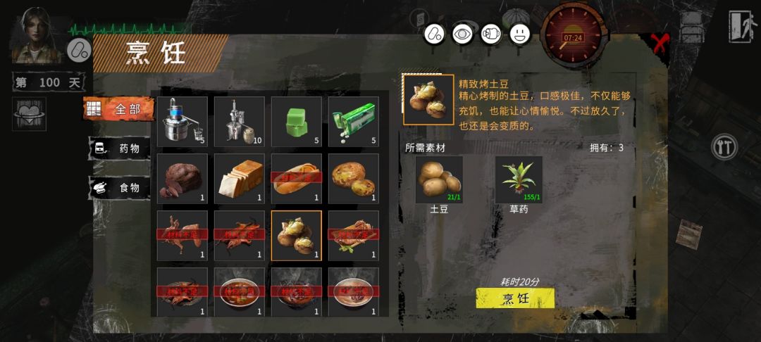 囤资源方法,早上六点起床吃饱,然后制作两个小时的夹板或者绷带在那20出来,去交换完后做四个精致烤土豆直接睡到第二天,以此类推,记得大棚的收获时间别忘了。