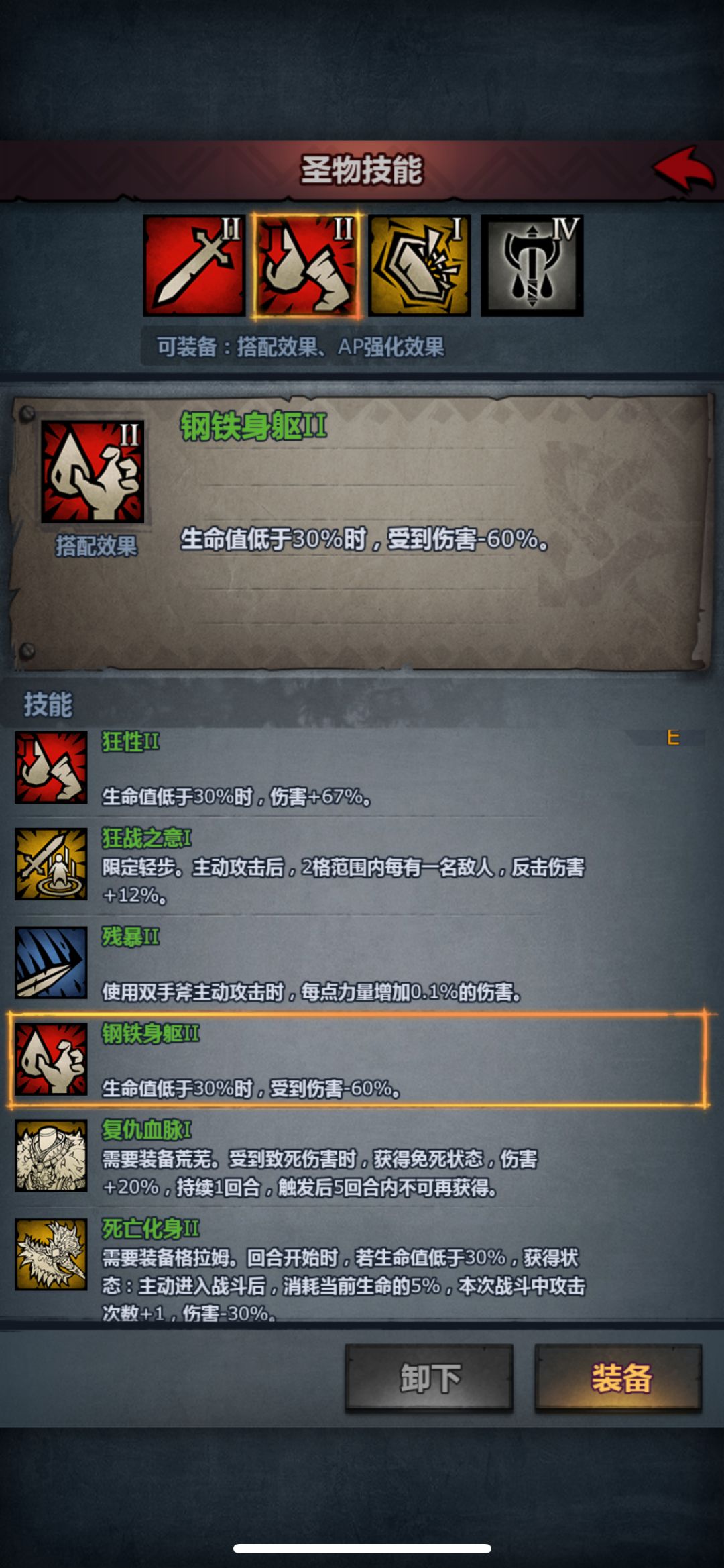 一直是我的回合为啥要免伤 满级荒芜也有高达90%的减伤 非常恐怖 配套头鞋建议选用处刑头鳄鱼靴圣物方面:有用的我认为主要是 狂性(压血加伤3级加伤100%)钢铁身躯(压血减伤最多90%)残暴(力量加伤满级667力即可伤害翻倍)毁灭(单手斧变斧圣) 死亡化身(压血变斧圣人人都能当剑圣) 复仇血脉(免死一次冷却较高)其中加伤的又更高贵一点