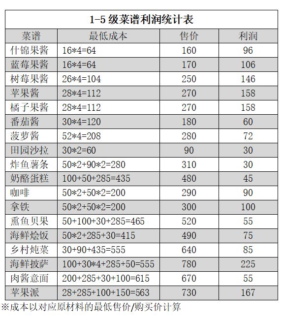 菜谱利润目前只统计到5级,利润率计算比较麻烦还在搞,之后算完会一点点加上的;
