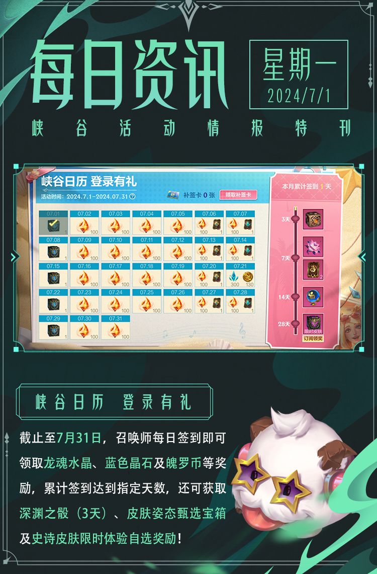 领略完海克斯峡谷,隆哥仿佛来到了充满策略与激情的奇幻世界。精彩不止于此!7月峡谷日历登录有礼活动正式开启,今日登录还可领取周一登录幸运宝箱,有概率获得龙魂水晶及史诗皮肤随机宝箱好礼~