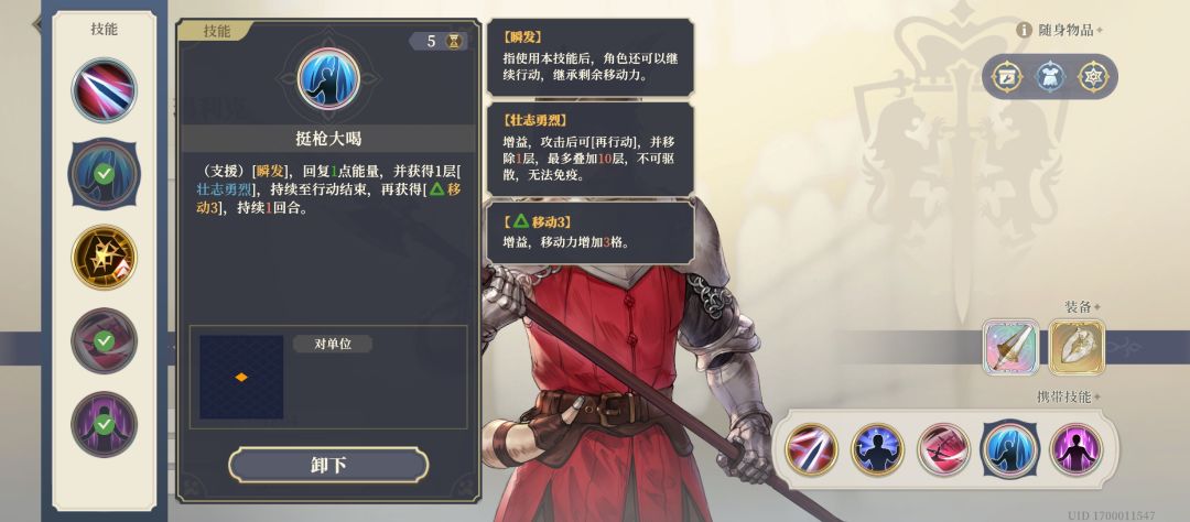 而这个名为“挺枪大喝”的瞬发技能,能叠1层再动,还给了3移动。这使得马利克第一回合就拥有高机动的3动。配合反应竟能4动,相当离谱。