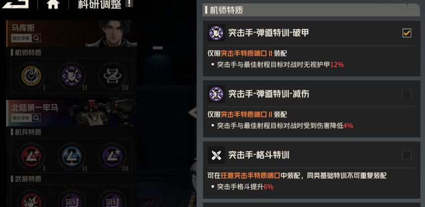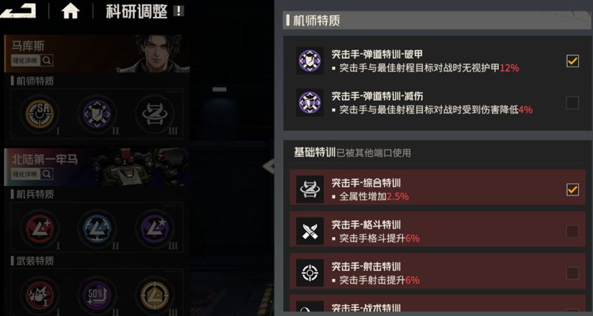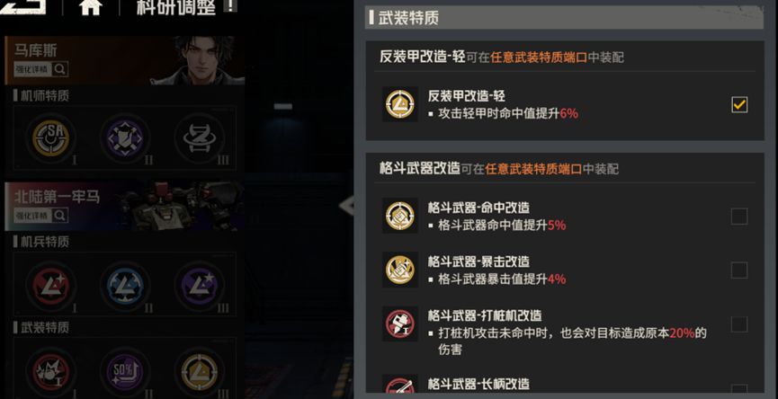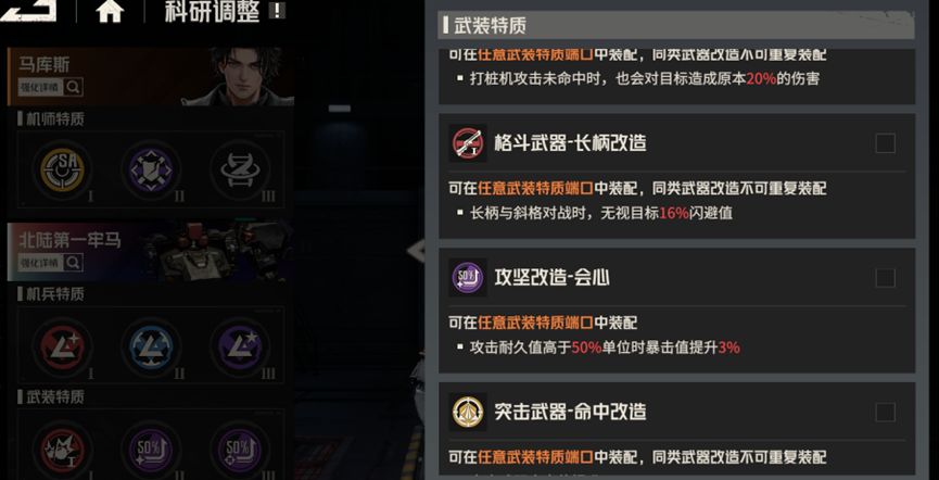 科研调整功能中可以为战术单位的不同端口插入不同的特质,但是以往存在特质插入端口不明确、同类型特质分类不明确、特质冲突等问题。优化后,特质分类有了直观表现;一个端口能插入哪些特质,也能一目了然。科研调整更加方便了